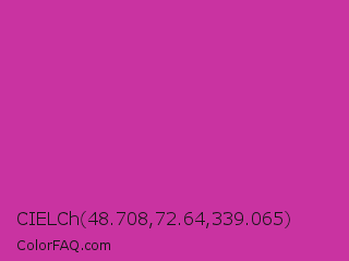 CIELCh 48.708,72.64,339.065 Color is a normal magenta color and the nearest color is Byzantine #bd33a4. Hex code #c933a1 and RGB value is rgb(201,51,161). In RGB color space, this color is composed of 79% red, 20% green, 63% blue, In CMYK color space, this color is composed of 0% cyan, 75% magenta, 20% yellow , 21% black , In HSL color space, this color has a hue angle of 316° , 60% saturation and 49% lightness.