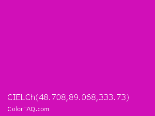 CIELCh 48.708,89.068,333.73 Color is a normal magenta color and the nearest color is Deep Magenta #cc00cc. Hex code #d10fb8 and RGB value is rgb(209,15,184). In RGB color space, this color is composed of 82% red, 6% green, 72% blue, In CMYK color space, this color is composed of 0% cyan, 93% magenta, 12% yellow , 18% black , In HSL color space, this color has a hue angle of 308° , 87% saturation and 44% lightness.