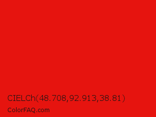 CIELCh 48.708,92.913,38.81 Color is a normal red color and the nearest color is KU Crimson #e8000d. Hex code #e6140f and RGB value is rgb(230,20,15). In RGB color space, this color is composed of 90% red, 8% green, 6% blue, In CMYK color space, this color is composed of 0% cyan, 91% magenta, 93% yellow , 10% black , In HSL color space, this color has a hue angle of 1° , 88% saturation and 48% lightness.