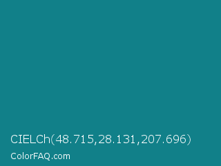 CIELCh 48.715,28.131,207.696 Color is a dark cyan color and the nearest color is Metallic Seaweed #0a7e8c. Hex code #118089 and RGB value is rgb(17,128,137). In RGB color space, this color is composed of 7% red, 50% green, 54% blue, In CMYK color space, this color is composed of 88% cyan, 7% magenta, 0% yellow , 46% black , In HSL color space, this color has a hue angle of 185° , 78% saturation and 30% lightness.