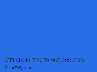 CIELCh 48.726,70.967,288.636 Color is a normal blue color and the nearest color is Blue Crayola #1f75fe. Hex code #286ee7 and RGB value is rgb(40,110,231). In RGB color space, this color is composed of 16% red, 43% green, 91% blue, In CMYK color space, this color is composed of 83% cyan, 52% magenta, 0% yellow , 9% black , In HSL color space, this color has a hue angle of 218° , 80% saturation and 53% lightness.