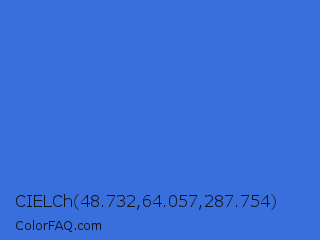 CIELCh 48.732,64.057,287.754 Color is a normal blue color and the nearest color is Royal Blue #4169e1. Hex code #386fdc and RGB value is rgb(56,111,220). In RGB color space, this color is composed of 22% red, 44% green, 86% blue, In CMYK color space, this color is composed of 75% cyan, 50% magenta, 0% yellow , 14% black , In HSL color space, this color has a hue angle of 220° , 70% saturation and 54% lightness.
