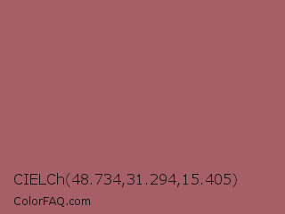 CIELCh 48.734,31.294,15.405 Color is a normal red color and the nearest color is Deep Puce #a95c68. Hex code #a75f67 and RGB value is rgb(167,95,103). In RGB color space, this color is composed of 65% red, 37% green, 40% blue, In CMYK color space, this color is composed of 0% cyan, 43% magenta, 38% yellow , 35% black , In HSL color space, this color has a hue angle of 353° , 29% saturation and 51% lightness.