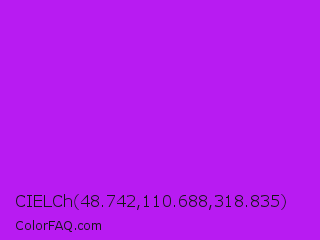 CIELCh 48.742,110.688,318.835 Color is a normal purple color and the nearest color is Vivid Mulberry #b80ce3. Hex code #b81bf2 and RGB value is rgb(184,27,242). In RGB color space, this color is composed of 72% red, 11% green, 95% blue, In CMYK color space, this color is composed of 24% cyan, 89% magenta, 0% yellow , 5% black , In HSL color space, this color has a hue angle of 284° , 89% saturation and 53% lightness.