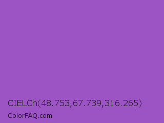 CIELCh 48.753,67.739,316.265 Color is a normal purple color and the nearest color is Deep Lilac #9955bb. Hex code #9c54c4 and RGB value is rgb(156,84,196). In RGB color space, this color is composed of 61% red, 33% green, 77% blue, In CMYK color space, this color is composed of 20% cyan, 57% magenta, 0% yellow , 23% black , In HSL color space, this color has a hue angle of 279° , 49% saturation and 55% lightness.