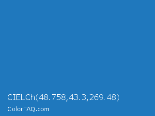 CIELCh 48.758,43.3,269.48 Color is a normal blue color and the nearest color is Cyan Cornflower Blue #188bc2. Hex code #1f78bd and RGB value is rgb(31,120,189). In RGB color space, this color is composed of 12% red, 47% green, 74% blue, In CMYK color space, this color is composed of 84% cyan, 37% magenta, 0% yellow , 26% black , In HSL color space, this color has a hue angle of 206° , 72% saturation and 43% lightness.