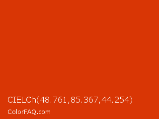 CIELCh 48.761,85.367,44.254 Color is a normal red color and the nearest color is Grenadier #d54600. Hex code #d93605 and RGB value is rgb(217,54,5). In RGB color space, this color is composed of 85% red, 21% green, 2% blue, In CMYK color space, this color is composed of 0% cyan, 75% magenta, 98% yellow , 15% black , In HSL color space, this color has a hue angle of 14° , 95% saturation and 44% lightness.
