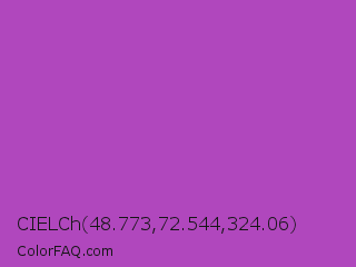 CIELCh 48.773,72.544,324.06 Color is a normal magenta color and the nearest color is Fuchsia Pink #c154c1. Hex code #b047bd and RGB value is rgb(176,71,189). In RGB color space, this color is composed of 69% red, 28% green, 74% blue, In CMYK color space, this color is composed of 7% cyan, 62% magenta, 0% yellow , 26% black , In HSL color space, this color has a hue angle of 293° , 47% saturation and 51% lightness.