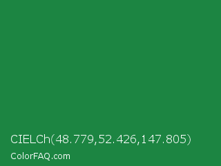 CIELCh 48.779,52.426,147.805 Color is a normal green color and the nearest color is Dark Spring Green #177245. Hex code #1c8542 and RGB value is rgb(28,133,66). In RGB color space, this color is composed of 11% red, 52% green, 26% blue, In CMYK color space, this color is composed of 79% cyan, 0% magenta, 50% yellow , 48% black , In HSL color space, this color has a hue angle of 142° , 65% saturation and 32% lightness.