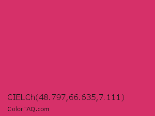 CIELCh 48.797,66.635,7.111 Color is a normal rose color and the nearest color is Cerise Red #de3163. Hex code #d63069 and RGB value is rgb(214,48,105). In RGB color space, this color is composed of 84% red, 19% green, 41% blue, In CMYK color space, this color is composed of 0% cyan, 78% magenta, 51% yellow , 16% black , In HSL color space, this color has a hue angle of 339° , 67% saturation and 51% lightness.