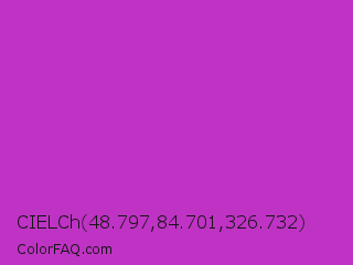 CIELCh 48.797,84.701,326.732 Color is a normal magenta color and the nearest color is Steel Pink #cc33cc. Hex code #bf33c4 and RGB value is rgb(191,51,196). In RGB color space, this color is composed of 75% red, 20% green, 77% blue, In CMYK color space, this color is composed of 3% cyan, 74% magenta, 0% yellow , 23% black , In HSL color space, this color has a hue angle of 298° , 59% saturation and 48% lightness.