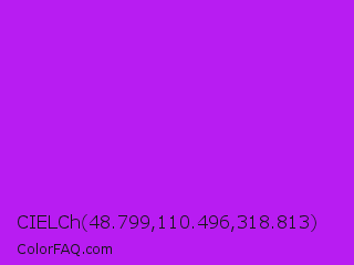 CIELCh 48.799,110.496,318.813 Color is a normal purple color and the nearest color is Vivid Mulberry #b80ce3. Hex code #b81cf2 and RGB value is rgb(184,28,242). In RGB color space, this color is composed of 72% red, 11% green, 95% blue, In CMYK color space, this color is composed of 24% cyan, 88% magenta, 0% yellow , 5% black , In HSL color space, this color has a hue angle of 284° , 89% saturation and 53% lightness.