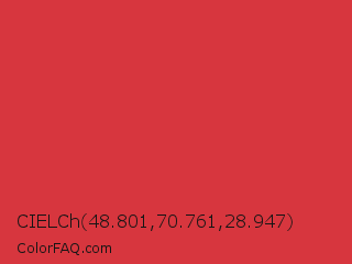 CIELCh 48.801,70.761,28.947 Color is a normal red color and the nearest color is Jasper #d73b3e. Hex code #d7363e and RGB value is rgb(215,54,62). In RGB color space, this color is composed of 84% red, 21% green, 24% blue, In CMYK color space, this color is composed of 0% cyan, 75% magenta, 71% yellow , 16% black , In HSL color space, this color has a hue angle of 357° , 67% saturation and 53% lightness.