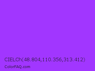 CIELCh 48.804,110.356,313.412 Color is a light purple color and the nearest color is Veronica #a020f0. Hex code #a136ff and RGB value is rgb(161,54,255). In RGB color space, this color is composed of 63% red, 21% green, 100% blue, In CMYK color space, this color is composed of 37% cyan, 79% magenta, 0% yellow , 0% black , In HSL color space, this color has a hue angle of 272° , 100% saturation and 61% lightness.