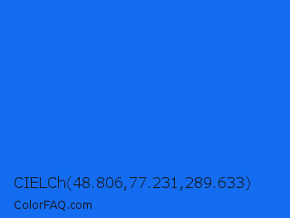 CIELCh 48.806,77.231,289.633 Color is a normal blue color and the nearest color is Blue Crayola #1f75fe. Hex code #146df1 and RGB value is rgb(20,109,241). In RGB color space, this color is composed of 8% red, 43% green, 95% blue, In CMYK color space, this color is composed of 92% cyan, 55% magenta, 0% yellow , 5% black , In HSL color space, this color has a hue angle of 216° , 89% saturation and 51% lightness.
