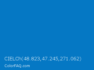 CIELCh 48.823,47.245,271.062 Color is a normal blue color and the nearest color is Ocean Boat Blue #0077be. Hex code #0578c4 and RGB value is rgb(5,120,196). In RGB color space, this color is composed of 2% red, 47% green, 77% blue, In CMYK color space, this color is composed of 97% cyan, 39% magenta, 0% yellow , 23% black , In HSL color space, this color has a hue angle of 204° , 95% saturation and 39% lightness.
