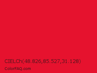 CIELCh 48.826,85.527,31.128 Color is a normal red color and the nearest color is Medium Candy Apple Red #e2062c. Hex code #e6122e and RGB value is rgb(230,18,46). In RGB color space, this color is composed of 90% red, 7% green, 18% blue, In CMYK color space, this color is composed of 0% cyan, 92% magenta, 80% yellow , 10% black , In HSL color space, this color has a hue angle of 352° , 85% saturation and 49% lightness.
