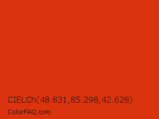 CIELCh 48.831,85.298,42.628 Color is a normal red color and the nearest color is Vermilion #d9381e. Hex code #db330d and RGB value is rgb(219,51,13). In RGB color space, this color is composed of 86% red, 20% green, 5% blue, In CMYK color space, this color is composed of 0% cyan, 77% magenta, 94% yellow , 14% black , In HSL color space, this color has a hue angle of 11° , 89% saturation and 45% lightness.