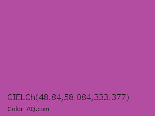 CIELCh 48.84,58.084,333.377 Color is a normal magenta color and the nearest color is Pearly Purple #b768a2. Hex code #b34da1 and RGB value is rgb(179,77,161). In RGB color space, this color is composed of 70% red, 30% green, 63% blue, In CMYK color space, this color is composed of 0% cyan, 57% magenta, 10% yellow , 30% black , In HSL color space, this color has a hue angle of 311° , 40% saturation and 50% lightness.
