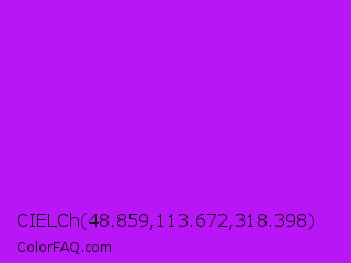 CIELCh 48.859,113.672,318.398 Color is a normal purple color and the nearest color is Vivid Mulberry #b80ce3. Hex code #b816f7 and RGB value is rgb(184,22,247). In RGB color space, this color is composed of 72% red, 9% green, 97% blue, In CMYK color space, this color is composed of 26% cyan, 91% magenta, 0% yellow , 3% black , In HSL color space, this color has a hue angle of 283° , 93% saturation and 53% lightness.