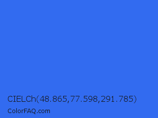 CIELCh 48.865,77.598,291.785 Color is a normal blue color and the nearest color is Ultramarine Blue #4166f5. Hex code #326bf0 and RGB value is rgb(50,107,240). In RGB color space, this color is composed of 20% red, 42% green, 94% blue, In CMYK color space, this color is composed of 79% cyan, 55% magenta, 0% yellow , 6% black , In HSL color space, this color has a hue angle of 222° , 86% saturation and 57% lightness.