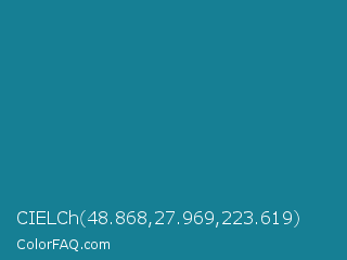 CIELCh 48.868,27.969,223.619 Color is a normal cyan color and the nearest color is Metallic Seaweed #0a7e8c. Hex code #167f94 and RGB value is rgb(22,127,148). In RGB color space, this color is composed of 9% red, 50% green, 58% blue, In CMYK color space, this color is composed of 85% cyan, 14% magenta, 0% yellow , 42% black , In HSL color space, this color has a hue angle of 190° , 74% saturation and 33% lightness.