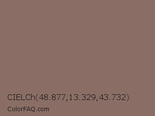 CIELCh 48.877,13.329,43.732 Color is a normal color and the nearest color is Sand Dune #826f65. Hex code #8a6e65 and RGB value is rgb(138,110,101). In RGB color space, this color is composed of 54% red, 43% green, 40% blue, In CMYK color space, this color is composed of 0% cyan, 20% magenta, 27% yellow , 46% black , In HSL color space, this color has a hue angle of 15° , 15% saturation and 47% lightness.