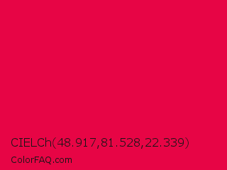 CIELCh 48.917,81.528,22.339 Color is a normal rose color and the nearest color is Red Ribbon #ed0a3f. Hex code #e70545 and RGB value is rgb(231,5,69). In RGB color space, this color is composed of 91% red, 2% green, 27% blue, In CMYK color space, this color is composed of 0% cyan, 98% magenta, 70% yellow , 9% black , In HSL color space, this color has a hue angle of 343° , 96% saturation and 46% lightness.