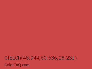 CIELCh 48.944,60.636,28.231 Color is a normal red color and the nearest color is English Vermillion #cc474b. Hex code #cc4547 and RGB value is rgb(204,69,71). In RGB color space, this color is composed of 80% red, 27% green, 28% blue, In CMYK color space, this color is composed of 0% cyan, 66% magenta, 65% yellow , 20% black , In HSL color space, this color has a hue angle of 359° , 57% saturation and 54% lightness.