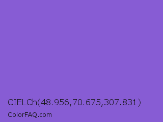 CIELCh 48.956,70.675,307.831 Color is a normal violet color and the nearest color is Amethyst #9966cc. Hex code #875cd4 and RGB value is rgb(135,92,212). In RGB color space, this color is composed of 53% red, 36% green, 83% blue, In CMYK color space, this color is composed of 36% cyan, 57% magenta, 0% yellow , 17% black , In HSL color space, this color has a hue angle of 262° , 58% saturation and 60% lightness.
