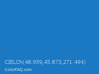 CIELCh 48.959,45.873,271.494 Color is a normal blue color and the nearest color is Bright Navy Blue #1974d2. Hex code #1b78c2 and RGB value is rgb(27,120,194). In RGB color space, this color is composed of 11% red, 47% green, 76% blue, In CMYK color space, this color is composed of 86% cyan, 38% magenta, 0% yellow , 24% black , In HSL color space, this color has a hue angle of 207° , 76% saturation and 43% lightness.