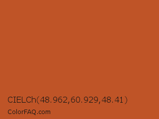 CIELCh 48.962,60.929,48.41 Color is a normal orange color and the nearest color is Tuscany #bd5e2e. Hex code #bf5427 and RGB value is rgb(191,84,39). In RGB color space, this color is composed of 75% red, 33% green, 15% blue, In CMYK color space, this color is composed of 0% cyan, 56% magenta, 80% yellow , 25% black , In HSL color space, this color has a hue angle of 18° , 66% saturation and 45% lightness.