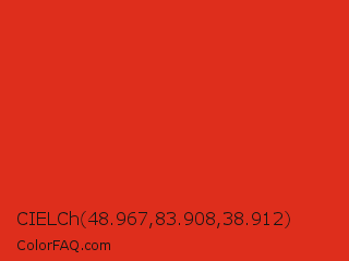 CIELCh 48.967,83.908,38.912 Color is a normal red color and the nearest color is Vermilion #d9381e. Hex code #de2e1c and RGB value is rgb(222,46,28). In RGB color space, this color is composed of 87% red, 18% green, 11% blue, In CMYK color space, this color is composed of 0% cyan, 79% magenta, 87% yellow , 13% black , In HSL color space, this color has a hue angle of 6° , 78% saturation and 49% lightness.