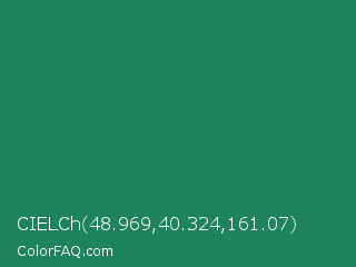 CIELCh 48.969,40.324,161.07 Color is a normal green color and the nearest color is Eucalyptus #278a5b. Hex code #1e845d and RGB value is rgb(30,132,93). In RGB color space, this color is composed of 12% red, 52% green, 36% blue, In CMYK color space, this color is composed of 77% cyan, 0% magenta, 30% yellow , 48% black , In HSL color space, this color has a hue angle of 157° , 63% saturation and 32% lightness.