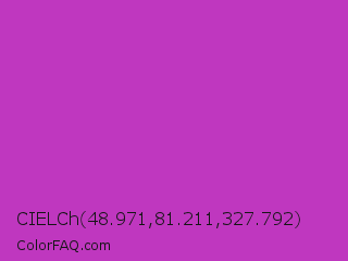 CIELCh 48.971,81.211,327.792 Color is a normal magenta color and the nearest color is Steel Pink #cc33cc. Hex code #bf37bf and RGB value is rgb(191,55,191). In RGB color space, this color is composed of 75% red, 22% green, 75% blue, In CMYK color space, this color is composed of 0% cyan, 71% magenta, 0% yellow , 25% black , In HSL color space, this color has a hue angle of 300° , 55% saturation and 48% lightness.