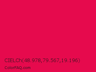 CIELCh 48.978,79.567,19.196 Color is a normal rose color and the nearest color is Razzmatazz Crayola #e30b5c. Hex code #e60a4d and RGB value is rgb(230,10,77). In RGB color space, this color is composed of 90% red, 4% green, 30% blue, In CMYK color space, this color is composed of 0% cyan, 96% magenta, 67% yellow , 10% black , In HSL color space, this color has a hue angle of 342° , 92% saturation and 47% lightness.