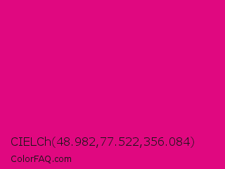 CIELCh 48.982,77.522,356.084 Color is a normal magenta color and the nearest color is Mexican Pink #e4007c. Hex code #e00880 and RGB value is rgb(224,8,128). In RGB color space, this color is composed of 88% red, 3% green, 50% blue, In CMYK color space, this color is composed of 0% cyan, 96% magenta, 43% yellow , 12% black , In HSL color space, this color has a hue angle of 327° , 93% saturation and 45% lightness.