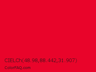CIELCh 48.98,88.442,31.907 Color is a normal red color and the nearest color is Spanish Red #e60026. Hex code #e9042a and RGB value is rgb(233,4,42). In RGB color space, this color is composed of 91% red, 2% green, 16% blue, In CMYK color space, this color is composed of 0% cyan, 98% magenta, 82% yellow , 9% black , In HSL color space, this color has a hue angle of 350° , 97% saturation and 46% lightness.
