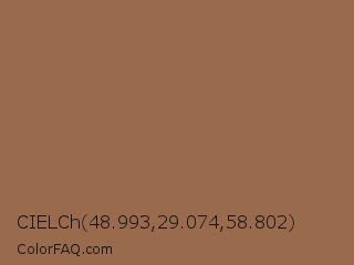 CIELCh 48.993,29.074,58.802 Color is a normal orange color and the nearest color is Cape Palliser #a26645. Hex code #996a4b and RGB value is rgb(153,106,75). In RGB color space, this color is composed of 60% red, 42% green, 29% blue, In CMYK color space, this color is composed of 0% cyan, 31% magenta, 51% yellow , 40% black , In HSL color space, this color has a hue angle of 24° , 34% saturation and 45% lightness.