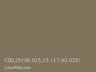CIELCh 49.015,15.117,93.033 Color is a normal orange color and the nearest color is Pablo #776f61. Hex code #7d745b and RGB value is rgb(125,116,91). In RGB color space, this color is composed of 49% red, 45% green, 36% blue, In CMYK color space, this color is composed of 0% cyan, 7% magenta, 27% yellow , 51% black , In HSL color space, this color has a hue angle of 44° , 16% saturation and 42% lightness.
