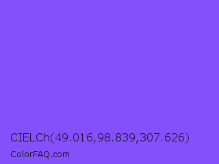 CIELCh 49.016,98.839,307.626 Color is a light indigo color and the nearest color is Navy Purple #9457eb. Hex code #854ffc and RGB value is rgb(133,79,252). In RGB color space, this color is composed of 52% red, 31% green, 99% blue, In CMYK color space, this color is composed of 47% cyan, 69% magenta, 0% yellow , 1% black , In HSL color space, this color has a hue angle of 259° , 97% saturation and 65% lightness.