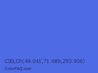 CIELCh 49.041,71.689,293.906 Color is a normal blue color and the nearest color is Royal Blue #4169e1. Hex code #4f6ae5 and RGB value is rgb(79,106,229). In RGB color space, this color is composed of 31% red, 42% green, 90% blue, In CMYK color space, this color is composed of 66% cyan, 54% magenta, 0% yellow , 10% black , In HSL color space, this color has a hue angle of 229° , 74% saturation and 60% lightness.