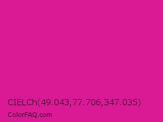 CIELCh 49.043,77.706,347.035 Color is a normal magenta color and the nearest color is Barbie Pink #e0218a. Hex code #d91a94 and RGB value is rgb(217,26,148). In RGB color space, this color is composed of 85% red, 10% green, 58% blue, In CMYK color space, this color is composed of 0% cyan, 88% magenta, 32% yellow , 15% black , In HSL color space, this color has a hue angle of 322° , 79% saturation and 48% lightness.