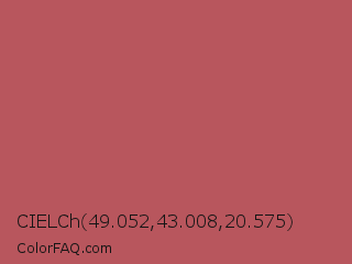 CIELCh 49.052,43.008,20.575 Color is a normal red color and the nearest color is Popstar #be4f62. Hex code #b8565d and RGB value is rgb(184,86,93). In RGB color space, this color is composed of 72% red, 34% green, 36% blue, In CMYK color space, this color is composed of 0% cyan, 53% magenta, 49% yellow , 28% black , In HSL color space, this color has a hue angle of 356° , 41% saturation and 53% lightness.