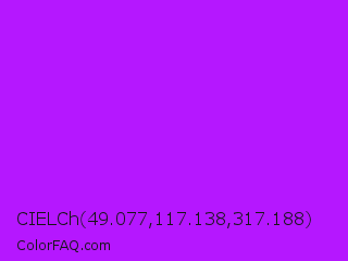 CIELCh 49.077,117.138,317.188 Color is a normal purple color and the nearest color is Electric Purple #bf00ff. Hex code #b517ff and RGB value is rgb(181,23,255). In RGB color space, this color is composed of 71% red, 9% green, 100% blue, In CMYK color space, this color is composed of 29% cyan, 91% magenta, 0% yellow , 0% black , In HSL color space, this color has a hue angle of 281° , 100% saturation and 55% lightness.