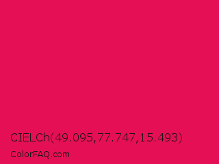 CIELCh 49.095,77.747,15.493 Color is a normal rose color and the nearest color is Razzmatazz Crayola #e30b5c. Hex code #e50f56 and RGB value is rgb(229,15,86). In RGB color space, this color is composed of 90% red, 6% green, 34% blue, In CMYK color space, this color is composed of 0% cyan, 93% magenta, 62% yellow , 10% black , In HSL color space, this color has a hue angle of 340° , 88% saturation and 48% lightness.