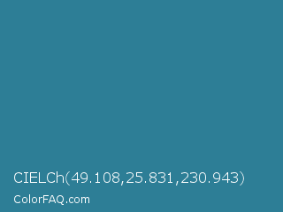 CIELCh 49.108,25.831,230.943 Color is a normal blue color and the nearest color is Jelly Bean #297b9a. Hex code #2d7e96 and RGB value is rgb(45,126,150). In RGB color space, this color is composed of 18% red, 49% green, 59% blue, In CMYK color space, this color is composed of 70% cyan, 16% magenta, 0% yellow , 41% black , In HSL color space, this color has a hue angle of 194° , 54% saturation and 38% lightness.