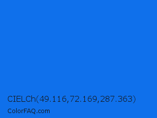CIELCh 49.116,72.169,287.363 Color is a normal blue color and the nearest color is Brandeis Blue #0070ff. Hex code #0f70eb and RGB value is rgb(15,112,235). In RGB color space, this color is composed of 6% red, 44% green, 92% blue, In CMYK color space, this color is composed of 94% cyan, 52% magenta, 0% yellow , 8% black , In HSL color space, this color has a hue angle of 214° , 88% saturation and 49% lightness.