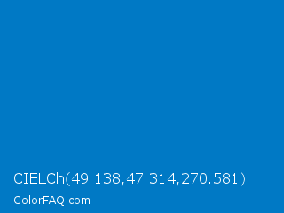 CIELCh 49.138,47.314,270.581 Color is a normal blue color and the nearest color is Lochmara #007ec7. Hex code #0079c5 and RGB value is rgb(0,121,197). In RGB color space, this color is composed of 0% red, 47% green, 77% blue, In CMYK color space, this color is composed of 100% cyan, 39% magenta, 0% yellow , 23% black , In HSL color space, this color has a hue angle of 203° , 100% saturation and 39% lightness.