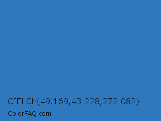 CIELCh 49.169,43.228,272.082 Color is a normal blue color and the nearest color is Mariner #286acd. Hex code #2e78be and RGB value is rgb(46,120,190). In RGB color space, this color is composed of 18% red, 47% green, 75% blue, In CMYK color space, this color is composed of 76% cyan, 37% magenta, 0% yellow , 25% black , In HSL color space, this color has a hue angle of 209° , 61% saturation and 46% lightness.